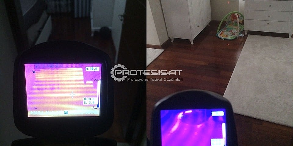 Ekiplerimiz termal kamera ile kalorifer tesisatındaki boruların tamamını incelerler. Kalorifer boruları termal kamerada düz bir doğrultuda görülürken, çatlak olan kısımda dağılma görülür. Bu sayede su kaçağının olduğu yer noktasal olarak tespit edilir.